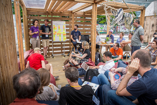 While smaller groups attended the master classes, others came together for two mornings of participatory, BarCamp-style workshops and discussions. This session on Platform Co-ops was co-hosted by Thomas Doennebrink and Alexandre Bigot-Verdier, both long-term members of Ouishare and activists in the platform co-op movement.