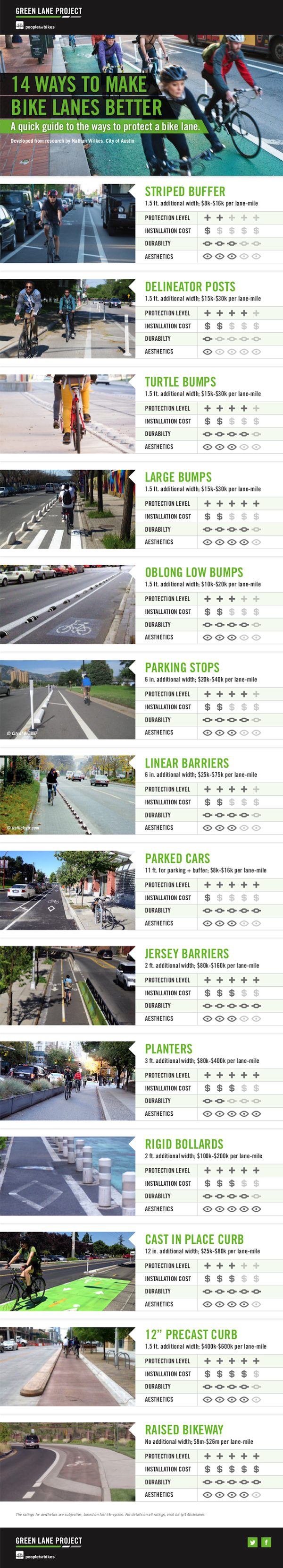 Recently, People for Bikes created an infographic, based on the work of Nathan Wilkes, spelling out all the ways to create protected bike lanes and the costs associated with each one. Both informative and inspirational, the graphic is intended to “quickly get [people] up to speed on the most popular tricks being used by cities around the world to improve bike lanes.”