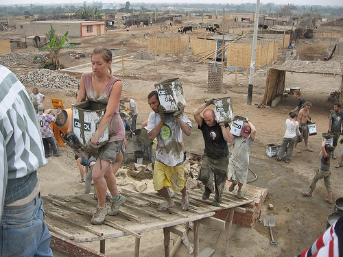 Volunteers build a school in Peru.