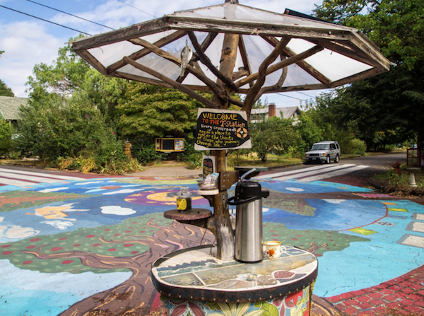 City Repair brings people together to reimagine the places they live and to re-create the commons. The organization started its work by reclaiming these spaces through direct action, such as their iconic Share It Square project, where neighbors came together and decided, despite the Portland city government, that their intersection would be improved by a central mural, a tiny library box, a self-serving solar-powered tea station, a community message board, and a children’s play space. They created these features themselves. Now, the City of Portland recognizes the great benefit these common spaces provide and has permitted the process of Intersection Repair.