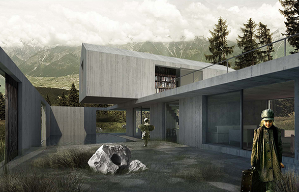 "An Imaginary House for Silence reflects upon an enduring interest in creating a space that is formed by a close relationship with nature, where one can live intimately in the natural world. The house emerges from the essence of the forest, where towering trees surround and protect the body, creating a magical environment of dappled light in the quiet solitude of nature. By our human weakness, we are moved to leave a contemplative and tranquil mark on the site. Like a cloister, characterized by its intimacy and purity, the structure thoughtfully concentrates the elements and the surrounding environment in an architectural space."