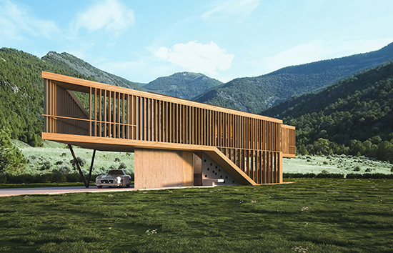 "A house designed to build on sloped land, generally more affordable than flat land. Staggered rectangular volumes are adaptable to inclined terrain, and modular distribution allows for simple extensions. Maximize living space and minimize wall construction. Enclosure is made of structural insulated panels and creates a highly thermally efficient building with the lowest cost-per-R available. Different cladding options available. White metal depicted. In proposed version: 3 BR/2 BATH, living room, open kitchen, and study."