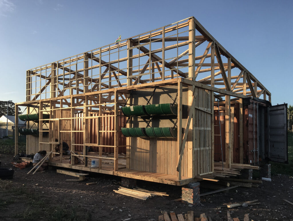 The Lim’uphile agricultural cooperative is located on a former brownfield on the western edge of the Walmer township in Cape Town. Founded by a local resident, Xolani Siwa, the co-op trains local youth in organizing events and growing vegetables. It was built collaboratively after Siwa met in 2018 with architects from the French design group Collectif Saga, which assisted with the design and construction of the new facilities, including a training hall, plant nursery, shop, kitchen, and a washroom block.