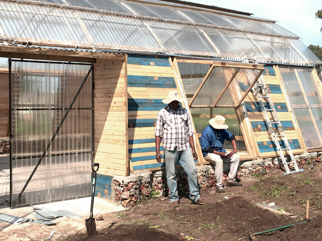 The construction process started with materials found onsite, and was open to young co-op members, job seekers, local folks, and international volunteers. They transformed a 27-meter greenhouse made of reclaimed materials into the nursery and hall. The work group also covered a shipping container with carpet squares, and built a wood-frame extension to accommodate the shop and kitchen. The work environment was collaborative, and the construction process became part of the youth-training program.