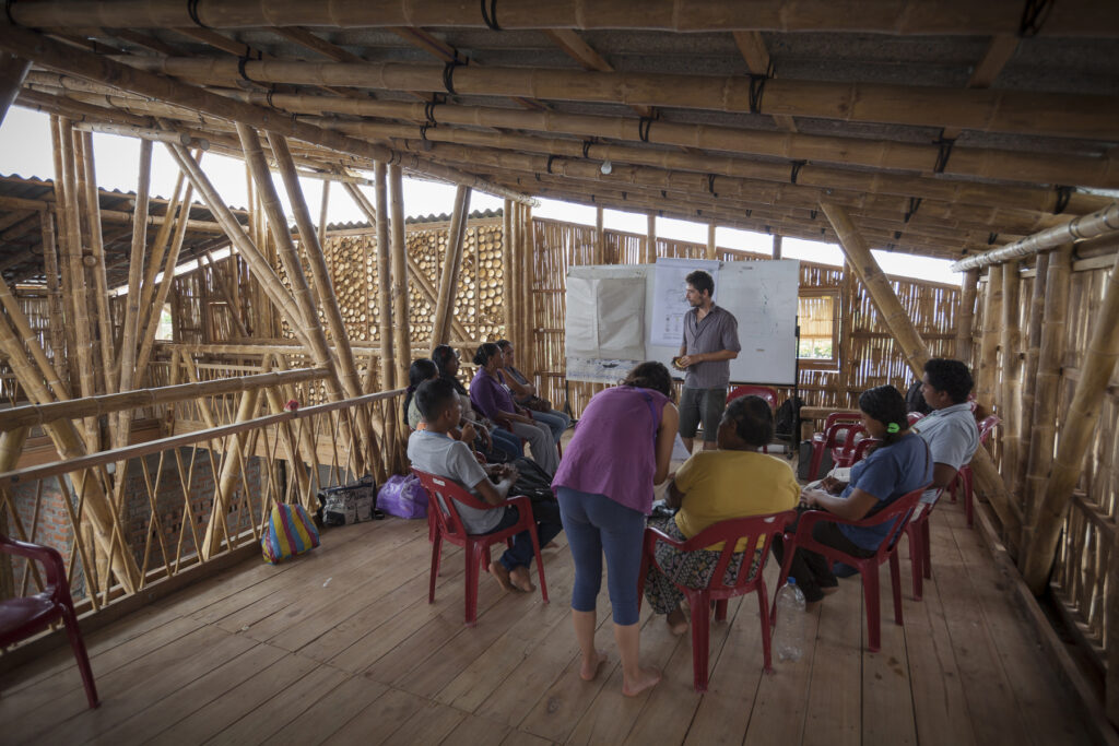 The design process connected students, community members, and professionals resulting in a pair of parallel spaces within a larger atrium that can be opened to the public during events. The first floor is built with bricks and reinforced concrete to withstand future earthquakes; the second floor is framed in local bamboo and wood, keeping the space naturally lit and ventilated. Recycled Tetra Pak sheets were used for the roofing, improving the acoustics and providing insulation. The building also uses tanks to harvest rainwater, and provides dry toilet systems.