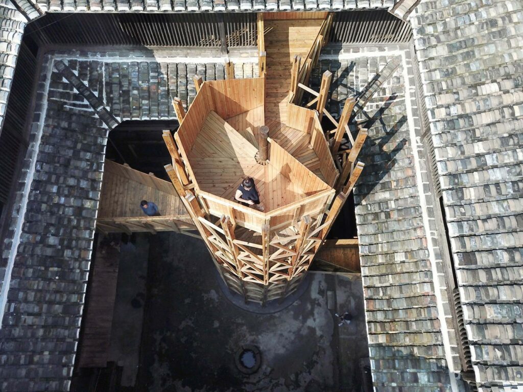 The project has retrofitted two of Lantian’s tulous, producing a more open and accessible structure. Once an enclosed fortification full of private residences, these re-imagined tulous now house libraries and work spaces; their central courtyards now feature shared, spiral staircases that connect the building’s multiple levels.