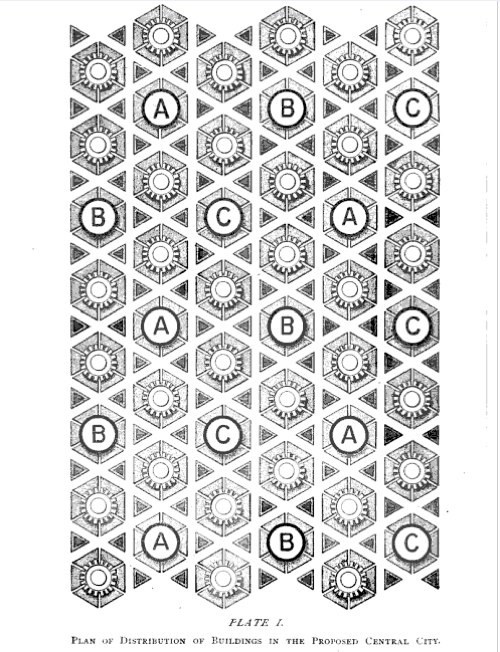 Gillette laid his city out in a hexagonal grid that would accommodate the many vast, perfectly round buildings where people lived, worked, and indulged in recreation. In the image below, you can see how he planned to distribute buildings of different functions evenly throughout the city. He writes, "This small section shown in the plate contains thirty three apartment buildings: five educational buildings marked A, five amusement buildings marked B, and five buildings where food is stored and prepared marked C."