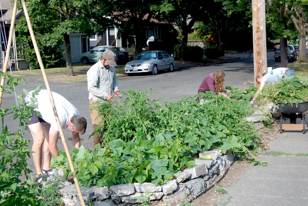 The scene captured the beauty of community gardening. But unlike traditional community gardens, such as the city of Seattle’s P-Patches, this farm is not on a lot—it’s on a parking strip between the sidewalk and the street. And rather than people working on their own plot within a larger garden, everyone here tends to the entire garden, which spans the length of two houses, collectively—primarily on a volunteer basis. Once a week, food from the farm is taken to a nearby food bank.