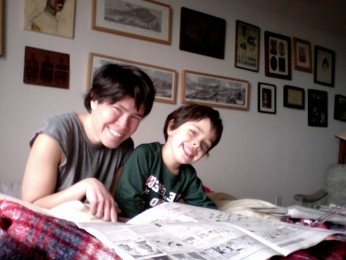 So great that as soon as I read this story, I jumped on my laptop to share it with all you Shareable.net readers — and right at the moment I’m totally ignoring my wife and son, who are sitting on the bed reading the newspaper together. Here’s a picture (taken two minutes ago with my laptop, so pardon the quality, and also their dishevelment–we all just woke up):
