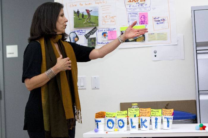 Mary Anne Petrillo from Cisco Systems demonstrating a new way to use networks to connect people for social good in health and education. Credit: Eli Marias