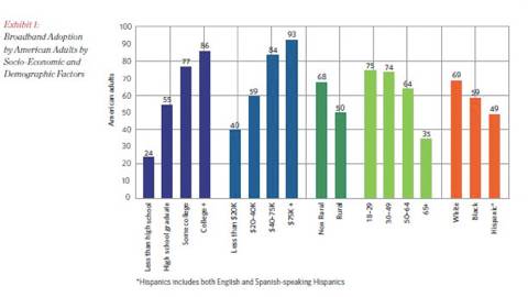 Few of us could imagine life without Internet access. Accessing the Internet for information, entertainment, and functions like banking are now well integrated in Americans’ daily lives. In March, the Pew Internet & American Life Project released results from a February 2012 survey indicating that 46% of Americans over 18 years own a smartphone, a 31% increase in less than 12 months. However, almost one-third of Americans do not subscribe to high-speed Internet services at home, which is now the primary metric used to segment the digital divide. This translates to a projected opportunity cost of .3% to 4.2% of GDP.