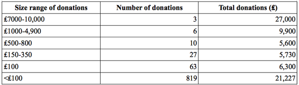 One business donated £4,900. All other donations were ₤1,000 or less, so it does not appear that any single donor exerted undue influence. Over 800 small donations under ₤100 (averaging around ₤25) made up a substantial 30 percent of the funding total and showed truly widespread support for the project. The public nature of these data helps to provide the evidence whether something is a pet project of a few rich people or has wide support.