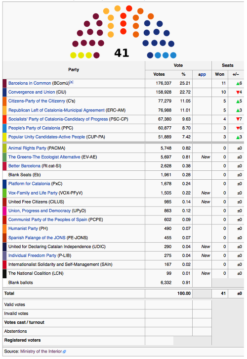 Barcelona en Comú won 11 of 41 city council seats in Sunday's election. (Wikipedia)