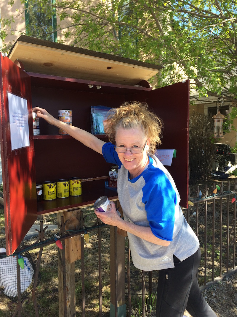 People put supplies in and take them out — some people trade stuff. Many people take more than they get. We bought the initial food but people are now giving us donations. We keep them in a sort of staging area in our yard. People can just come by and put stuff in or out. Some friends of ours who live far away have given us money, others have transferred us supermarket loyalty points. The cupboard has emptied and filled a few times throughout each day.