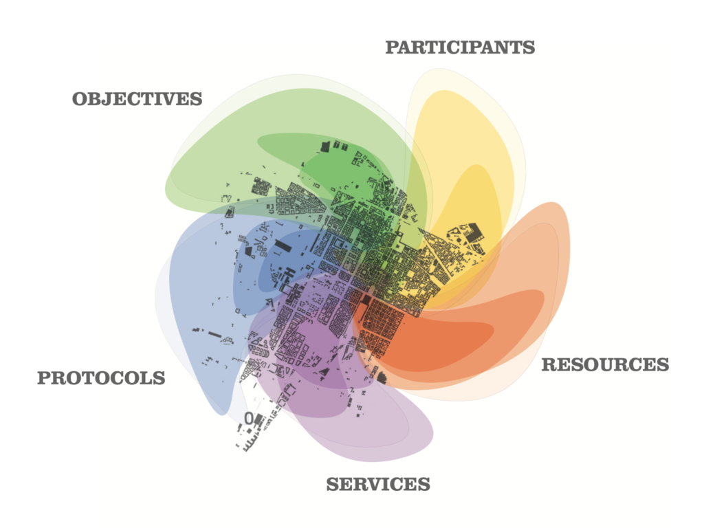 During a four-year European action-research, we worked with a wide range of people developing sustainable working spaces in Lisbon, Bilbao, Pula, London and Bordeaux. We discovered five interdependent aspects that governed the successful creation of these spaces: objectives, participants, resources, services and protocols. A certain set of objectives will unite a certain group of participants. These participants can then share their resources to propose services that are in tune with their objectives. Once an initiative reaches critical mass, protocols will be necessary, such as leases, prices and codes, so it can sustain itself. These five aspects became a frame for telling the stories of these places and later for presenting the work to international organisations such as the COP21 and the UN Creative Cities Network.