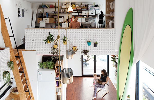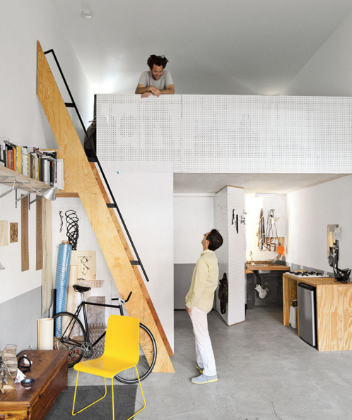 On his lot, Perez created eight community-focused live-work units for instructors, graduates, and students from Woodbury. The individual lofts, which are 450 square feet, each have double-high ceilings and outdoor space. Combined, they offer plenty of space for community interaction. As Dwell reports,