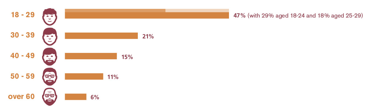 Just over half of reporting Homestay.com guests were 30 or older. (Homestay Index)