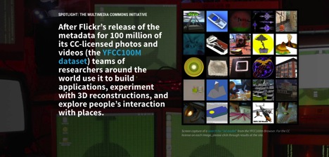 Highlights from our partners include the Freeharmonic Orchestra, a group of 12 musicians who met in a virtual room on the Free Music Archive to produce the most collaborative album ever. From our friends at Flickr comes the Multimedia Commons Initiative, where teams of researchers around the world utilize the epic 100 million image dataset to build new applications and explore people’s interaction with places.