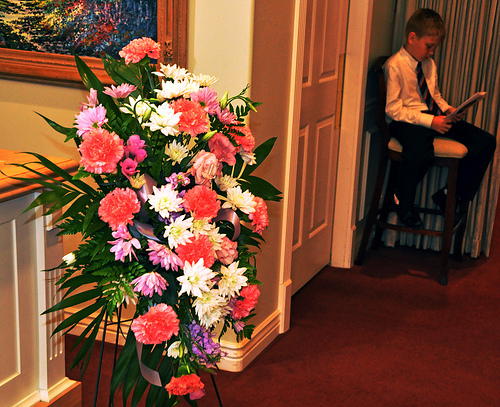 A young mourner sits near a bouquet of flowers in a funeral home. Photo credit: Berkeley T. Compton. Used under Creative Commons license.