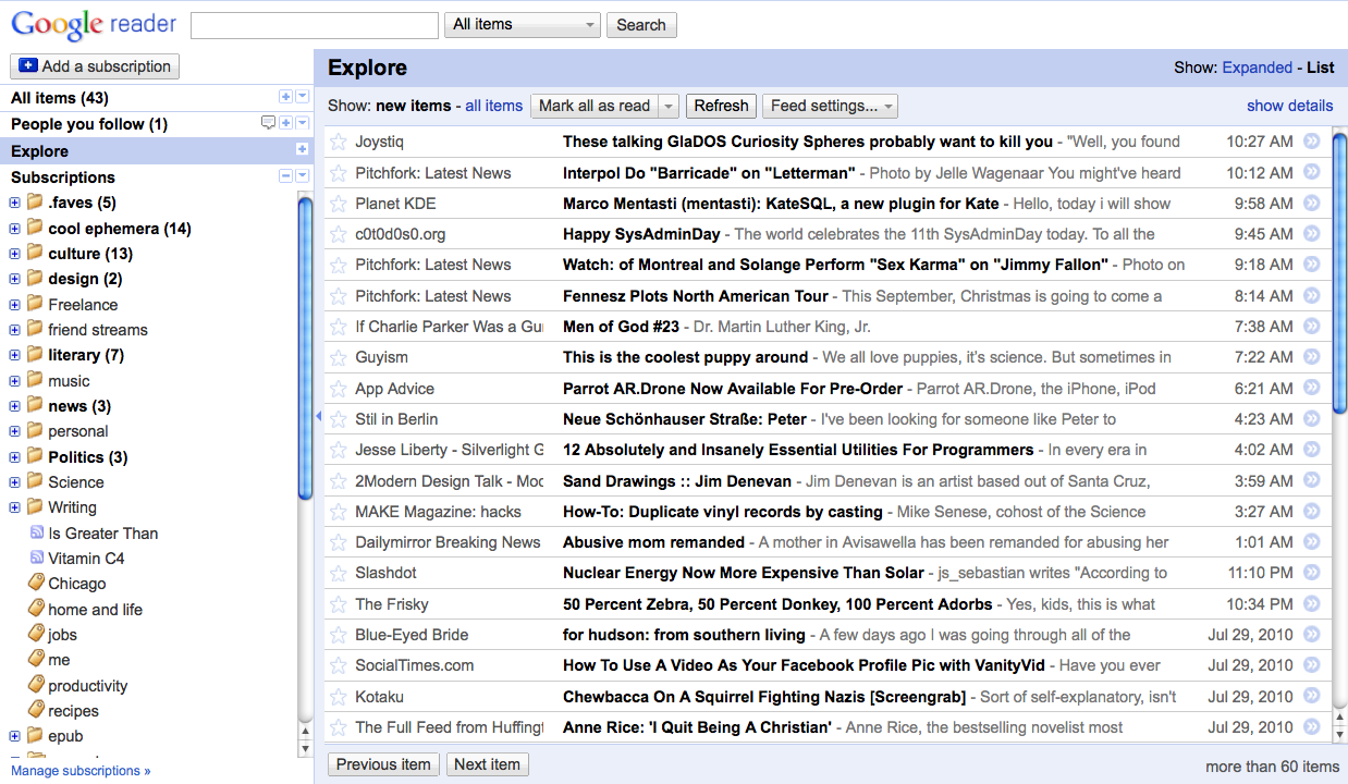 Google Reader's “explore” feed has proven to be a more effective discovery tool. It displays the most-shared items on Reader, filtered by the user’s interests. Reader determines which popular items are relevant to you by analyzing the types of feeds you’re already subscribed to. It’s shockingly effective: I’m often unsettled by how well Google’s algorithms determine my tastes and interests. The “explore” feed may be the most effective news discovery service you’ve never used.