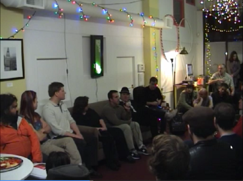 From left: Praveen Sinha (LOL), Jen-Mei Wu (LOL), David Rorex (Ace Monster Toys), Lisha Sterling (Hacker Moms), Joseph Jackson (Biocurious), Steven Young (The Crucible), Michael Scroggins (sudo room) and Mitch Altman (Noisebridge; kneeling, far right) speaking on the topic of "Hackerspaces: The Necessity of Community Spaces Here and Everywhere" during sudo room's kickraiser on May 4, 2012.