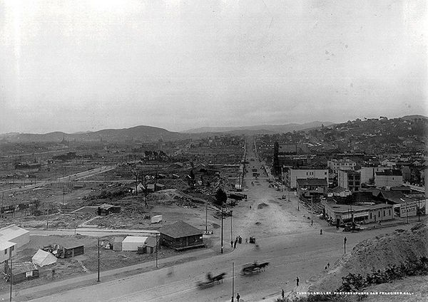 Looking south along Dolores Street after the devastating 1906 quake and fire, viewed from today's Mint Hill above Market.