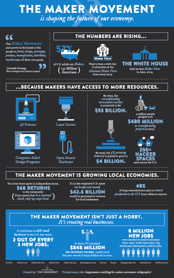But this is not just a network of hobbyists; the maker movement is poised to transform our economy by empowering everyday people and small business owners to design and manufacture their creations. The below infographic by The Grommet points out the movement’s transformative potential.
