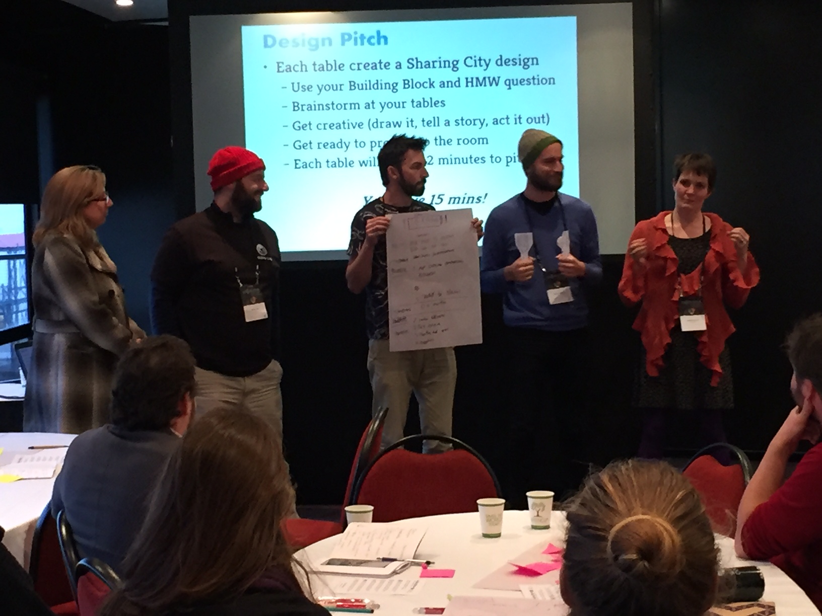 Participants were invited to participate in a workshop to answer this question: "How might we leverage shared assets and infrastructure to make Wellington a sharing city?" I have developed a set of open design principles called "Building Blocks for Sharing Cities" to help groups quickly prototype ideas to activate the urban commons. In this workshop, each table formed into a small design team and were invited to create a sharing cities design pitch related to one of six Building Blocks: Share, Fabricate, Repair, Activate, Steward and Grow.