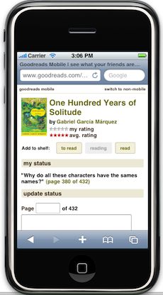 Goodreads hasn't quite become that idealized cocktail party that I desired–there's too little buy–in from my personal network, and a bit too much noise from strangers, a problem endemic to most social networks.