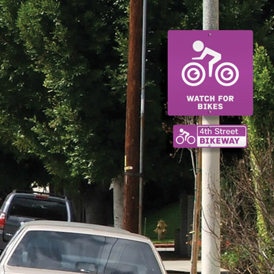 When I began exploring how bike route signage could be redesigned to increase its effectiveness for Los Angeles, I quickly discovered that a test case was in order. An existing route would need to be chosen so that I could assess the conditions and challenges that improved signage would have to contend with. One route sprung immediately to mind: 4th Street.