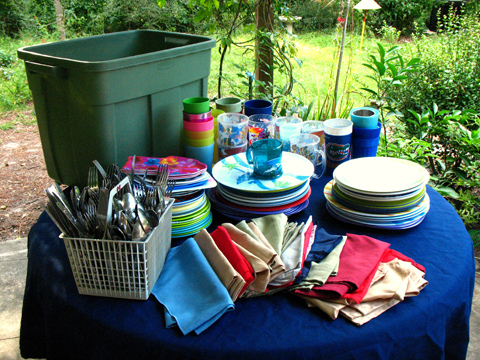 It’s true that it’s a bit of a storage issue, but we make sure to buy only nonbreakable items. Everything is stored in a 25-gallon plastic storage bin with a lid, making it easy to move in and out of car trunks and garages. When it’s at my house, Party Box lives in a shed in my carport. It is not pampered. And, yes, you have to WASH those dishes … but everything goes in the dishwasher.