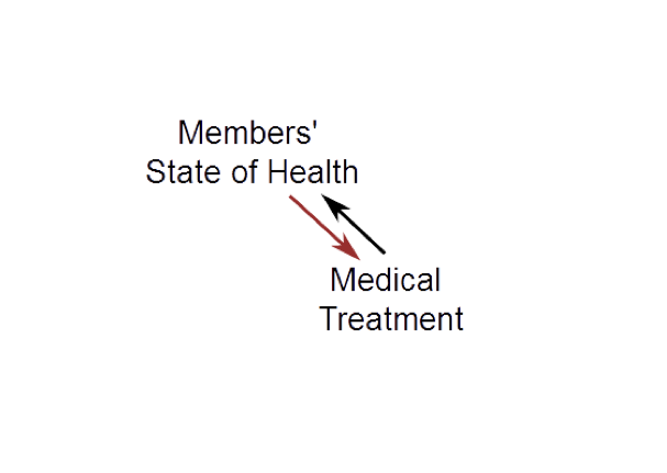 4. Draw arrows linking the terms that you've written on the page to show how they affect each other. The trick is to use a color code to distinguish between two main types of causal relationships. The color code I've used is this: A black arrow if more of the first item leads to more of the second item (which also means that less of the first item leads to less of the second item). For example, medical treatments are supposed to improve the members' state of health.