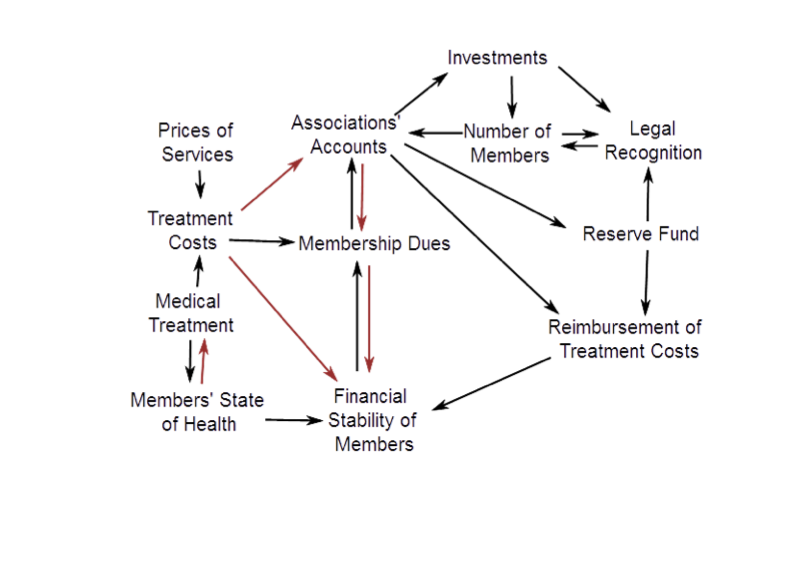 Solidago (like a consumer cooperative) does not involve the above feedback loop. If you study the Solidago graphic, you find several arrows leading from "associations' accounts" (the nearest thing to "profits" in the graphic) to "financial stability of members" (the core concern). Either treatment costs are reimbursed directly, or a reserve fund is built up to prepare for contingencies, or legal recognition is sought. But, there are also two red arrows: If Solidago were to be really flush with funds, members would likely vote to reduce membership dues and maintain their financial stability in this way – and this would reduce the amount of money available for investment. Consequently, Solidago can be better summarized by the graphic below: the need (of maintaining financial stability in the face of high medical costs) leads to various uses of funds to finance medical treatment, which reduces the need. Once the need is reduced, membership dues and therefore investments are reduced. This helps to reach a steady state, stabilizing resource consumption while actually making people happy.