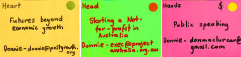 Ask participants to stick each post-it note on the relevant piece of butcher’s paper (Each should be labelled as Heart, Head, or Hands.) that will be on the ground or hanging nearby. Offer people a good amount of time to review what goes up.