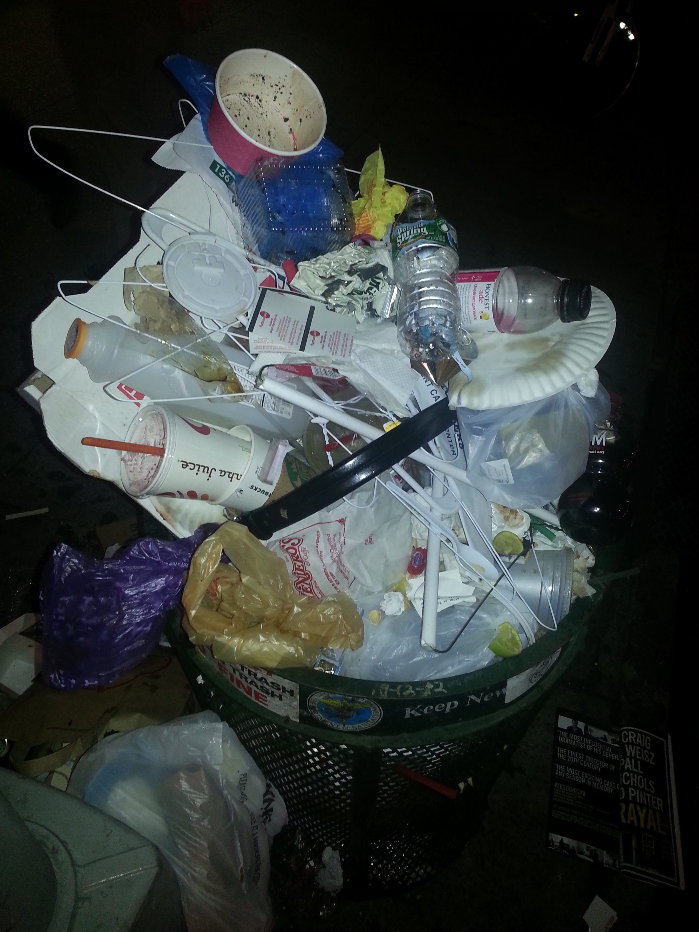 A trash bin full of containers that were used just once, and are now on their way to the landfill.