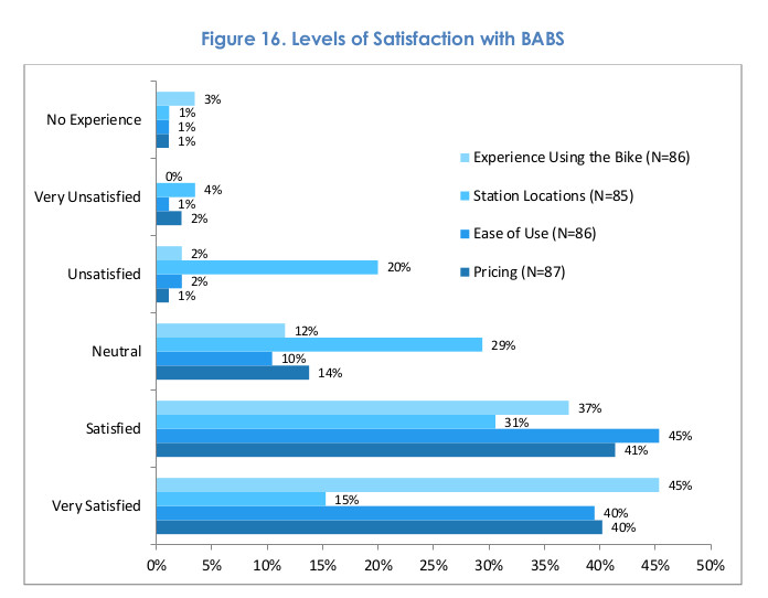 The researchers' primary conclusions have important implications for the future of bikesharing. While most casual users are generally satisfied with the existing system, the team found two areas of weakness through the study. First (and this is consistent with other recent findings) is station location and overall number of stations. Fifty-three percent of casual users surveyed by the team said they were "neutral," "unsatisfied," or "very unsatisfied" with BABS station locations. Nineteen percent of non-users (people who approached a BABS station, but decided against renting a bike), meanwhile, cited "inconvenient location of stations" as the single reason for not using bikeshare.