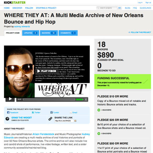 Kickstarter has had some notable successes in its short tenure: the service has helped fund an impressive number of creative projects. A few that come to mind include Where They At, a documentary film and online archive of queer New Orleans hip-hop, Coming & Crying, an anthology of stories about sex edited by Melissa Gira Grant and Meaghan O’Connell, and political cartoonist Ted Rall’s trip to Afghanistan for a hybrid comic/journalism project.