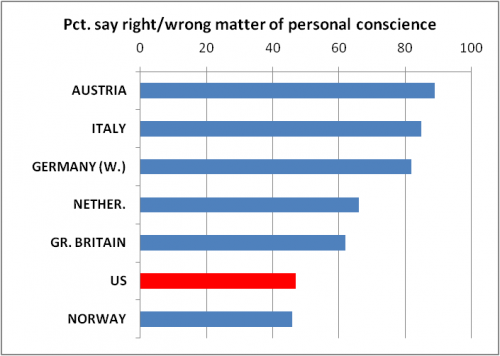 Fisher defines individualism as "Americans give priority to personal liberty," and uses a 2006 study by the International Social Survey Programme to make his point, gaging Americans' responses on matters of personal conscience, individual versus country, and individual versus family. In all cases, Fisher finds that Americans surveyed as being the least likely to prioritize individualism.