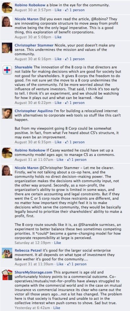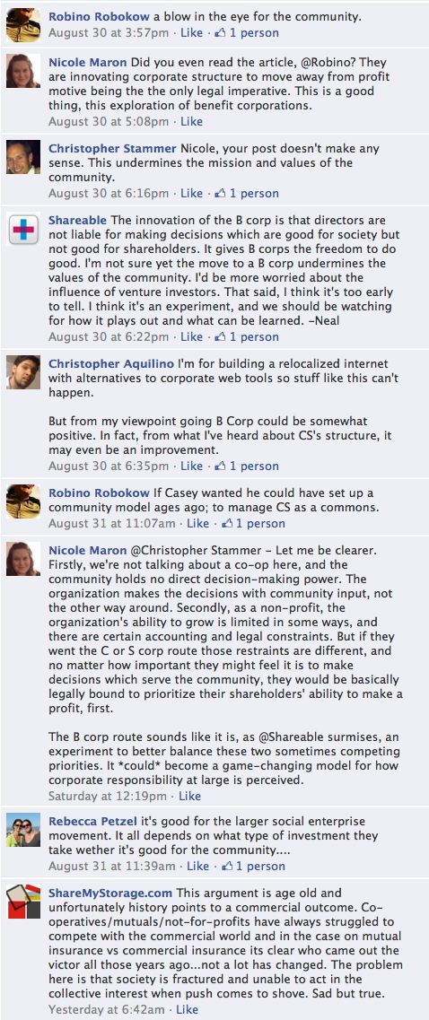 Malcolm Harris's article last week about Couchsurfing's transition from a non-profit model to a B Corporation inspired much debate about the implications for the service's community in both the original post's comments and on our Facebook page. Here are some of the top comments from Facebook: