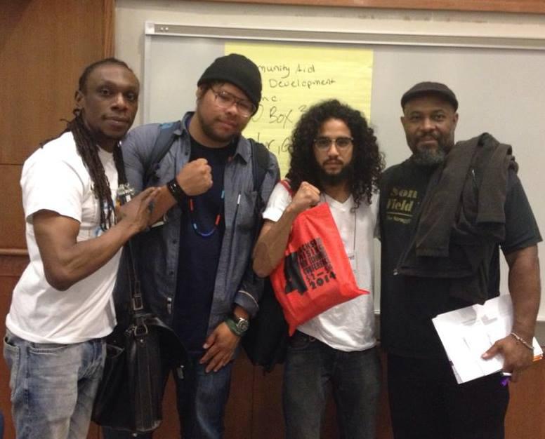 Members of the Detroit Delegation: (from left) Bryce Detroit, Sacramento Knoxx, and Antonio Cosme stand with Kali Akuno of Cooperation Jackson.