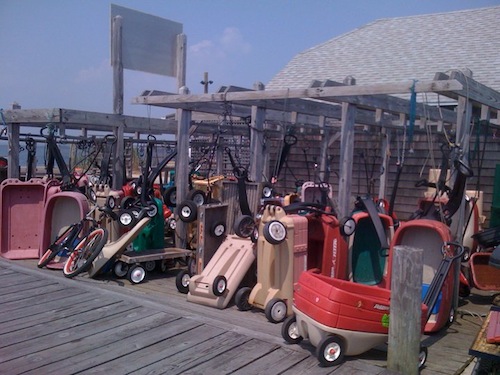 As a result, Fire Island is home to scenes that are sadly vanishing from the American landscape. Kids ride bikes, with or without a destination, on their own; parents who would never allow their kids to get on a bike in their car-choked urban or suburban neighborhoods or to take a bike ride by themselves are able to let them off the virtual leash a bit, since no cars means that pretty much the entire island is safe for new and learning riders. The few businesses and stores use cargo bikes for hauling and deliveries. Visitors use wagons to transport their luggage and groceries from the ferries to their houses (think old-school Radio Flyers).