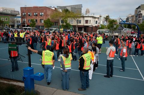 DPW Clean Team volunteers listen to instructions before heading out to spruce up District 6. Let's Do It SF! kicked of its volunteerism at this event.