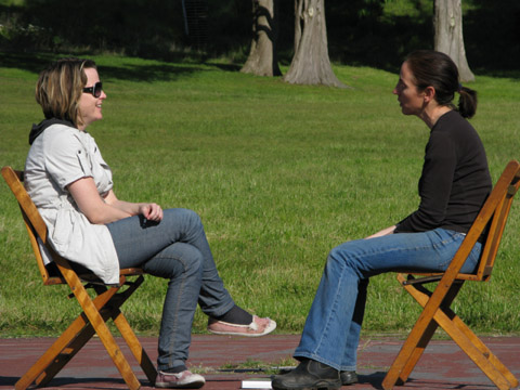 On a more conceptual level, listening in this way provides an opportunity for face-to-face conversation on the street when much public conversation now happens with either an absent listener — i.e. on a cell phone – or an absent speaker — i.e. with an iPod. I’m curious about how face-to-face interaction slightly shifts the general brisk-forward momentum of traffic in public spaces, allowing a small temporal dilation, a softening and widening of attention.