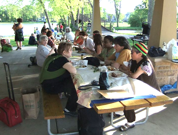 A potluck brings ShareFest participants together to share a meal