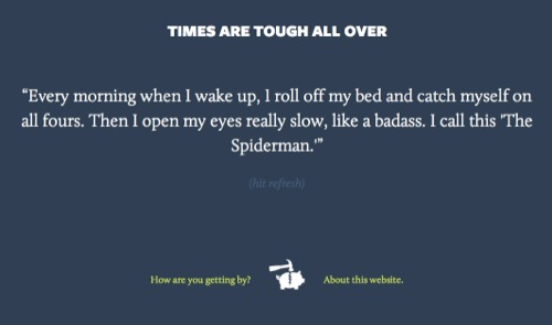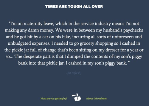 Times Are Tough All Over is a project by Chicago author Megan Stielstra and her husband, graphic designer and blogger Christopher Jobson, to document how people are coping and making ends meet. Inspired by a short story bearing the same name, Times Are Tough All Over invites visitors to share their stories of personal resilience. The site is elegantly simple: a short testimonial not much longer than a tweet is displayed on a spare blue background, and you can see more testimonials by refreshing the page.