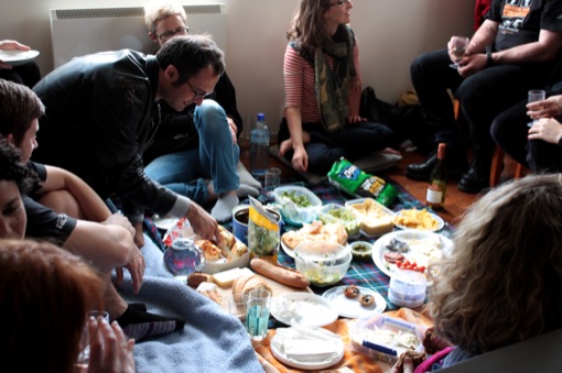 At the inside picnic, the atmosphere is electric–and that has nothing to do with the storms outside. Eavesdropping around the picnic rug, I hear interesting conversations about South Africa, Yoga and the recent change in the Parliament. I learn that you can easily ride from Berlin to Poland (without much preparation) and that Jodi (one of my guests) has recently produced a Cross(x) Species workshop / cocktail party by NY based artist, Natalie Jeremijenko in Melbourne.