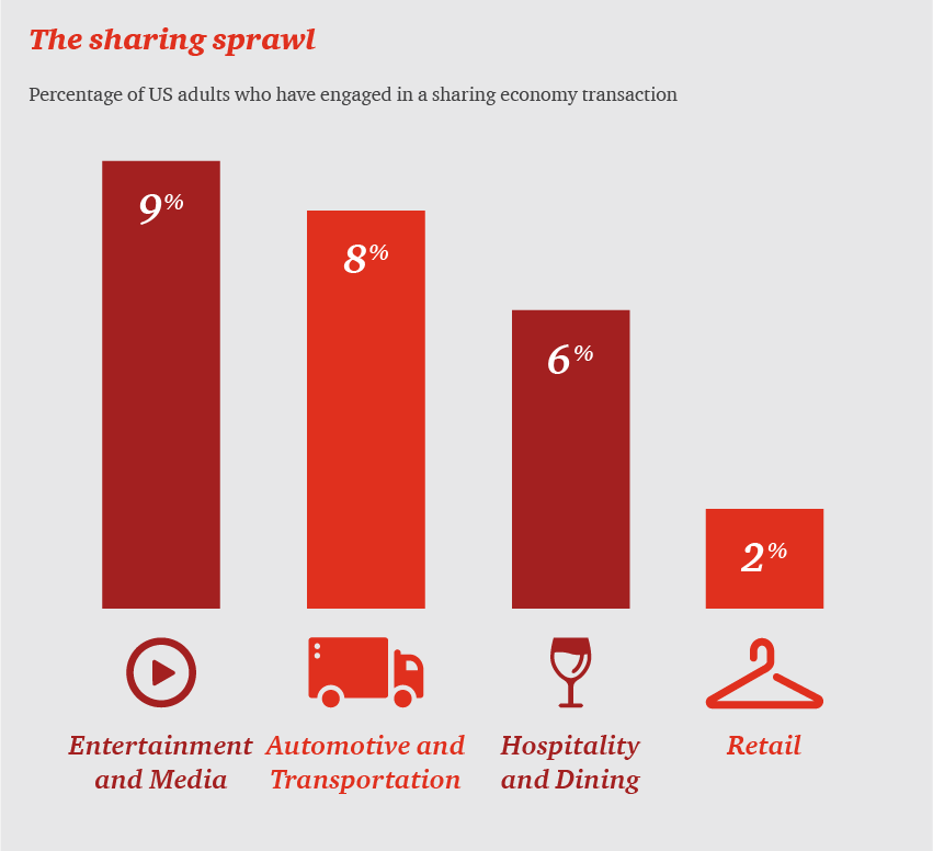 The PwC report focuses on for-profit sharing services in the automotive, retail, hospitality, and communications industries. (PwC)