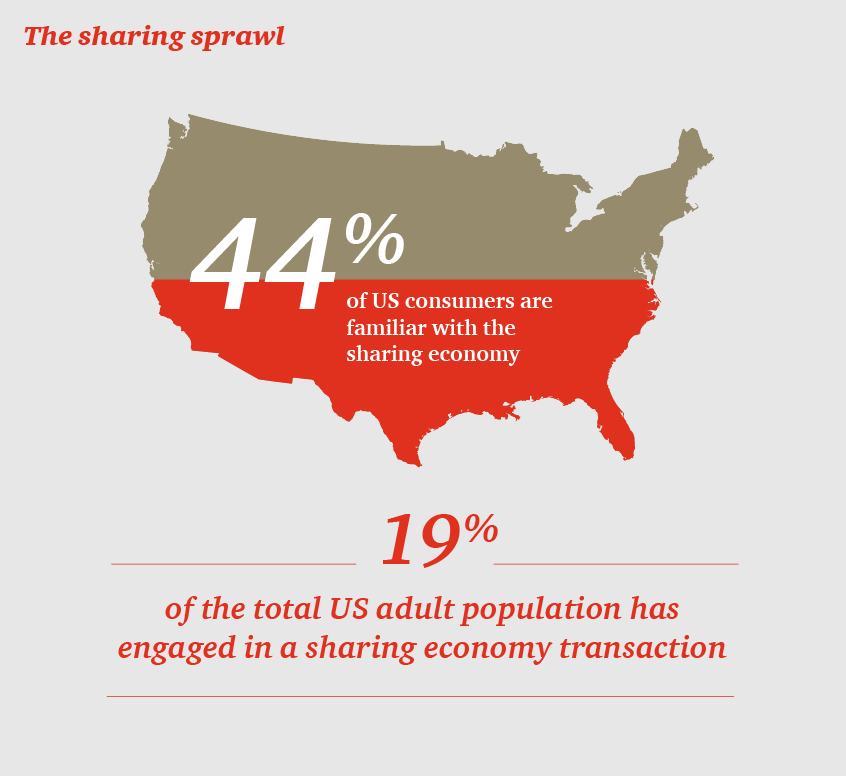 Just under half of consumers surveyed indicated familiarity with the for-profit sharing economy. (PwC)