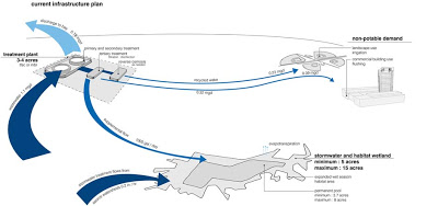 Hybridized land use: A 22-acre urban farm will produce enough food for 2,200 people, selling exclusively to residents, groceries, and restaurants on the island, but will also serve as a park and pedagogical area. Same with an artificial wetlands, which will serve as a recreational area as well as a way of treating runoff (see illustration below for the water treatment plan). The goal is to generate almost all energy on the island itself, using wind, solar, and a bio-gas plant. "The landscape is for cultivation, not consumption," said Hartman.