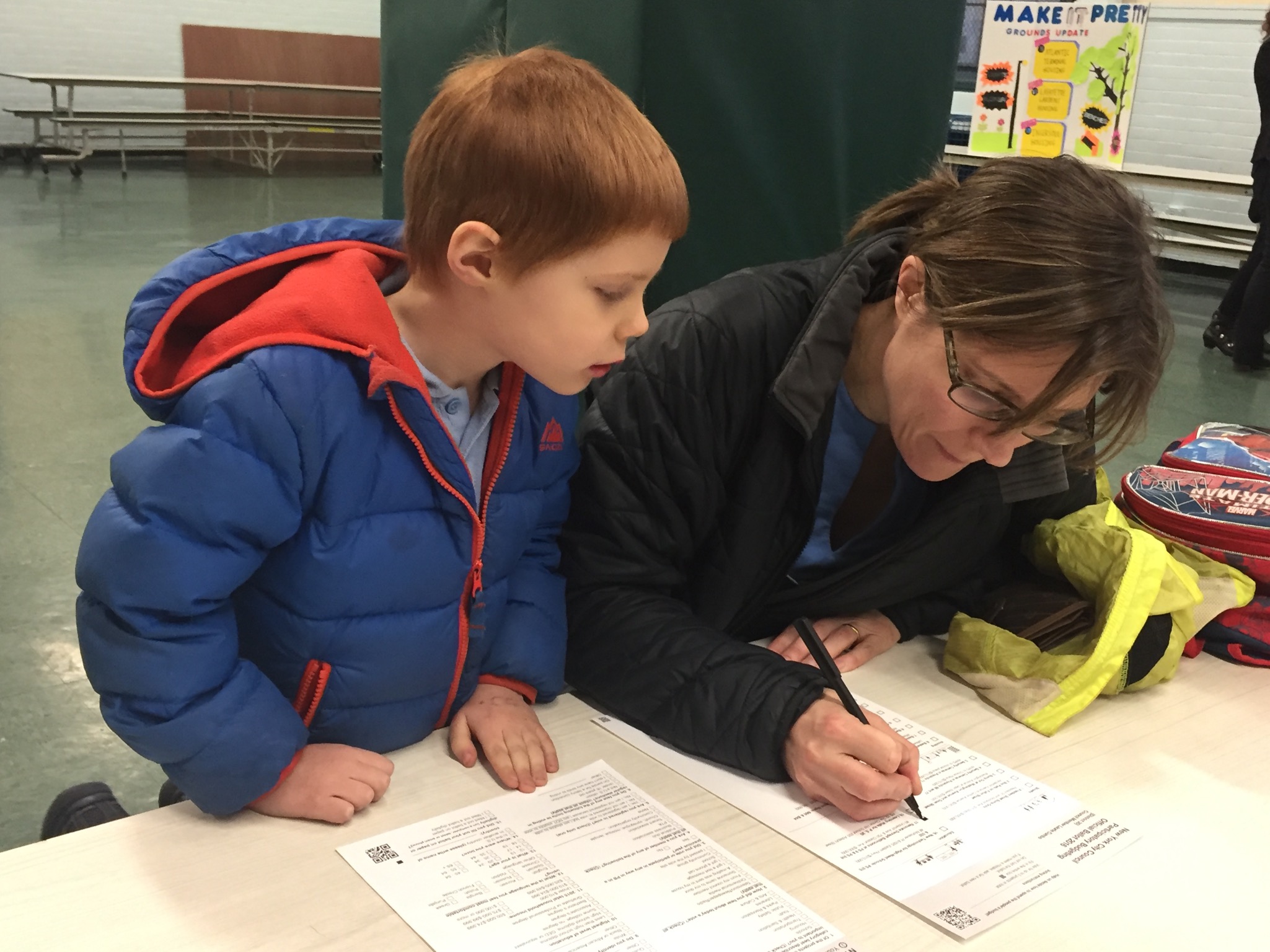 Young community member, Miro, checks out prosal ballots at the project expo in Brooklyn, New York.